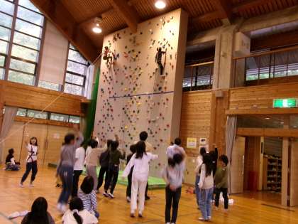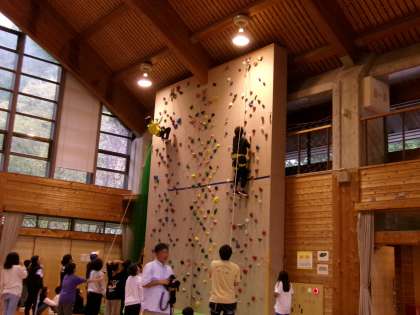 この記事は,クライミングの様子です。下で応援したり、先生と一緒に挑戦したりするなど,いい雰囲気です。