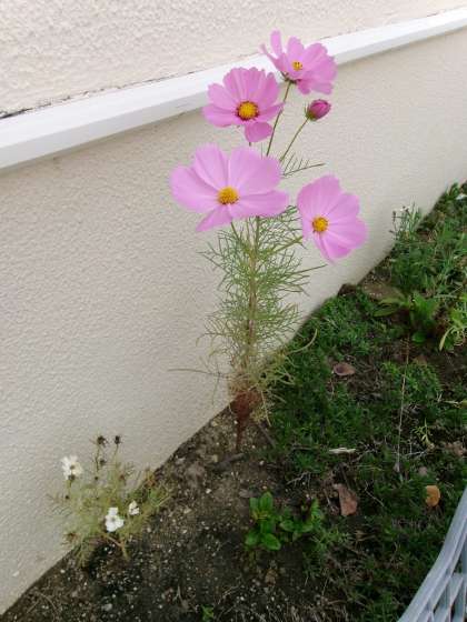 夏休み中の懸命な水やりにもかかわらず、猛暑と病気でほとんど枯れてしまったコスモスですが、きれいに咲いて、秋の訪れを知らせてくれている花もあります。きれいですね。