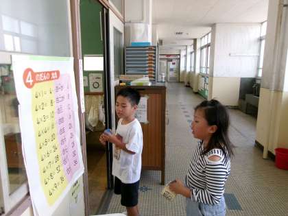 フッ化物洗口の後、コップを洗って教室に帰って来た時も、九九を唱える2年生でした。