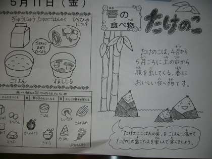 今日は,筍ごはんの具を自分でご飯に混ぜて「たけのこごはん」の献立でした。