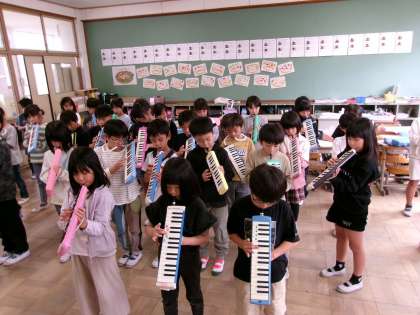 学年のみんなと一緒に鍵盤ハーモニカをふいたり、歌ったりしました。いつもと違うボリュームで楽しいですね。