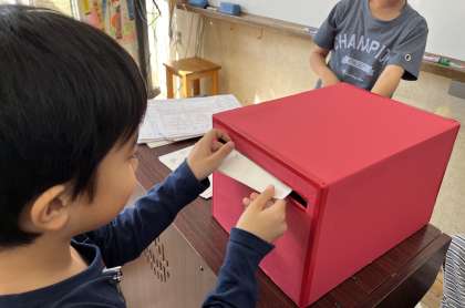 国語「お手紙」では、最後の学習で、がまくんやかえるくんに伝えたいことについて実際に手紙を書きました。お話を読んで感じたことや考えたこと、自分だったらこうすると思うことを文章にしました。書いた後は、赤いポストに投函してみました。がまくんやかえるくんに届きますように!