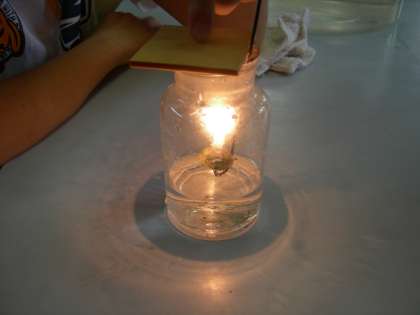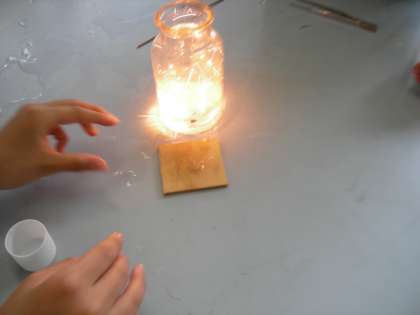 酸素を貯めた瓶の中に火のついたろうそくを入れると,明るく燃え,ろうそくの根本が溶けてしまうほどの激しさでした。線香を入れるとポッと音を立てて炎を出して燃えました。スチールウールに火をつけて入れると,線香花火のように火花を飛び散らせて燃えました。