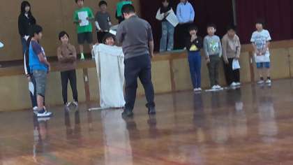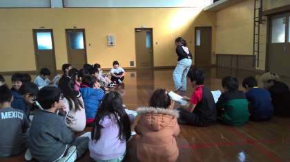 まなびの集いの練習が始まっています。3回目の今日は,2つのグループに分かれておじいさんやトルトリなど,役に合わせた動きのアイデアを出し合ったり,せりふと動きを合わせたりしてみました。色々,アイデアを出してくれました。