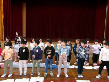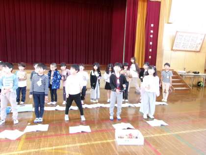 まなびの集いに向けて、体育館で練習をしていました。初めての「まなびの集い」がうまくいきますように。