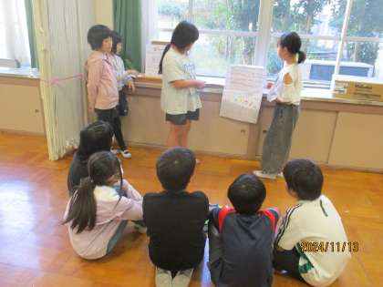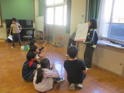 1組で活動しているチームと2組で活動しているチームで,お互いの遊びを紹介し合いました。2年生に紹介するつもりでやってみましたが,説明が足らずに質問をいっぱいされたり,うまく遊びがまとまらなかったり・・・。実際にやってみると,足りない部分がよくわかりました。来週は,課題に感じたことを修正したり,付け加えたりして,本番を迎えられるようにしていきます。