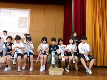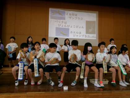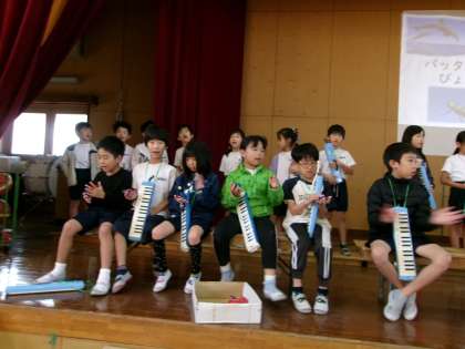 まなびの集いの練習の様子です。カスタネット・トライアングル・タンブリンのパートが練習していました。