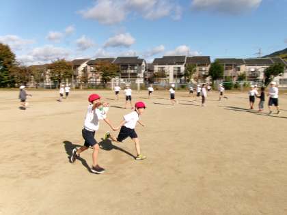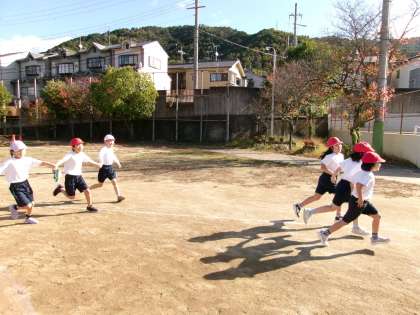 前は、ふえおにをしていました。今日は、手つなぎおに。いろいろなおに遊びがあって楽しいですね。