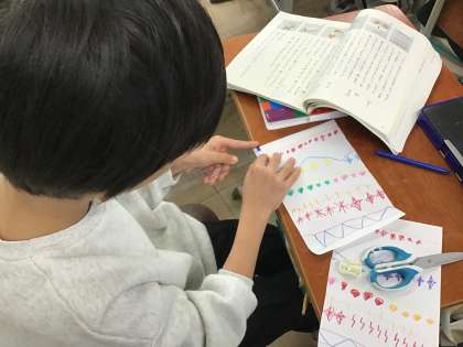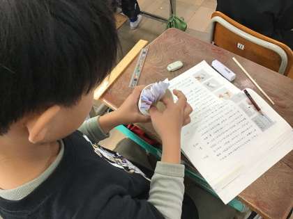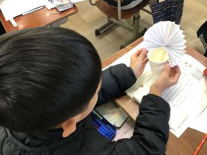 国語の学習では、作り方の文章を自分で読み取って、その通りに作ったら紙コップ花火のおもちゃが作れるのかに挑戦しています。教科書のどの言葉が分かりやすかったのかを見つけ、最後には、自分で作ったおもちゃの説明文を書く予定です。