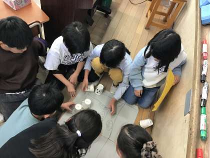 生活科「あそんでためしてくふうして」では、自分のつくりたいおもちゃを作った後、グループでどのように遊ぶか考え、お客さんにどのように説明したらいいか相談しています。実際に説明してみて、どうしたらもっとお客さんに伝わるか、おもちゃを楽しんでもらえるかを考えています。