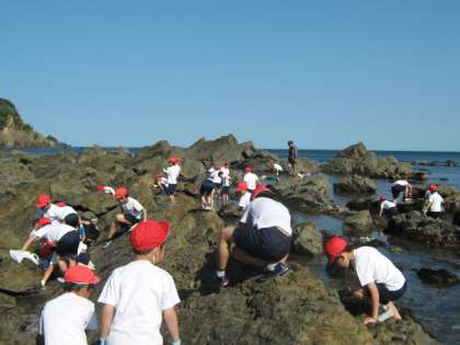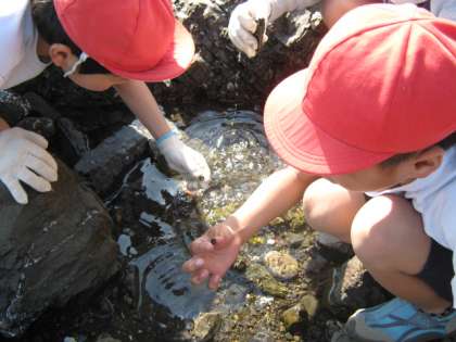 ヤドカリやヒトデ,カニに小魚,そして小さなタコなど,たくさんの生き物を見つけることができました。デコボコの岩場の上でバランスを取りながらの活動で,とても楽しかったです。