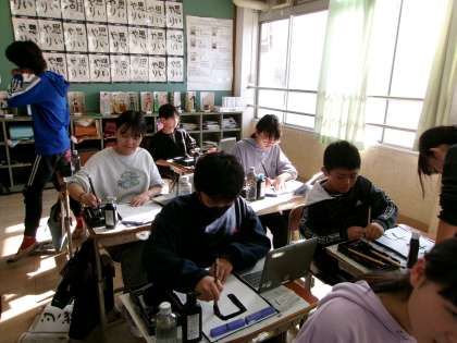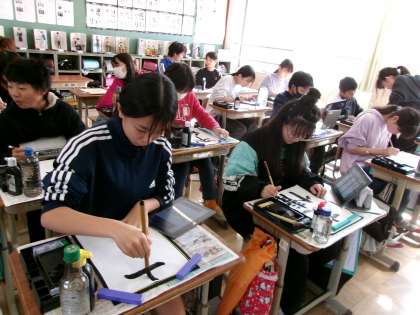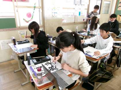 この前、他のクラスの作品を紹介しましたが、今日は自分で選んだ字を書いている場面の写真が撮れました。背筋をピンとのばして、集中して描いている姿はかっこよかったです。