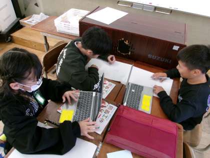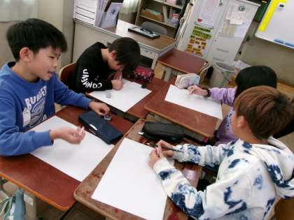 版画の下絵を描いていました。タブレットで資料を調べて、描いている子もいました。出来上がりが楽しみです。