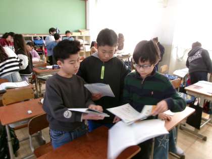 表を縦に見たり横に見たりして、わかったことを書きまとめていました。見つけたことを書けた子から、どんどん交流していました。
