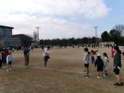 6年生が1年生を優しく練習場所に連れていき、たてわり班で大縄の練習をしていました。全校が中間休みに外に出て運動をするという素敵な学校の様子でした。