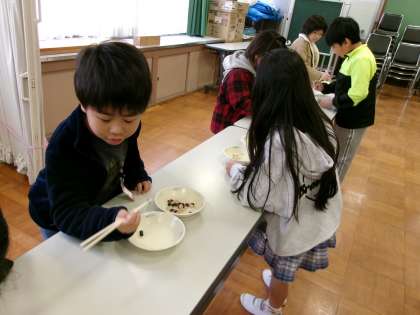 給食週間で、豆つまみ大会に参加。1年生の目標は、おはしで10つぶ運ぶことです。「わたし、7であと3つやった!」「わたしは、13つぶ。」「わたしは、16つぶ やった!」みんな それぞれがんばっていました。
