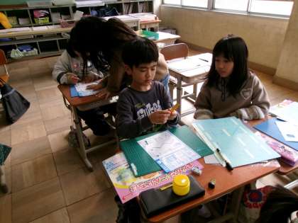 友だちに紙をおさえてもらいながら、初めてのカッターナイフ。慎重に、作業を進めていました。