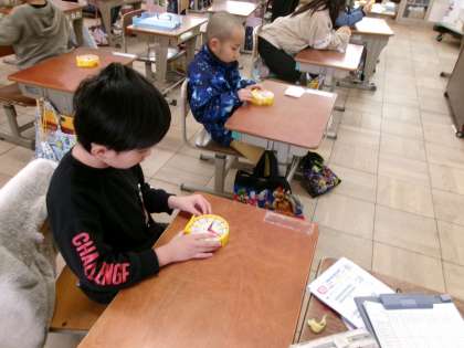 「時計の針を9時3分に合わしましょう。」という先生の指示を受けて、どうすればいいか考えていました。