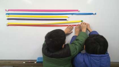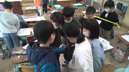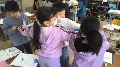 ところで、1mの長さは どのくらいか、わかってきたかな。班で協力して、紙テープを1mの長さに切り取ることに挑戦しました。前回の活動を思い出して、