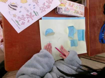窓をカッターナイフで作った後は、その窓から見えるものを描いていました。どんなものができるか楽しみですね。