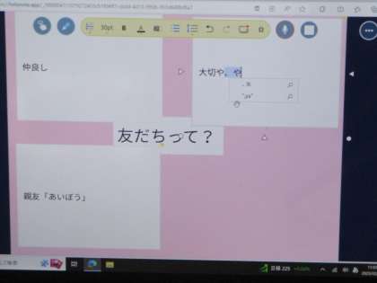 「友だちは,最高」「助けてくれる」「けんかしても仲直りできる」・・・など,色々な意見がでました。