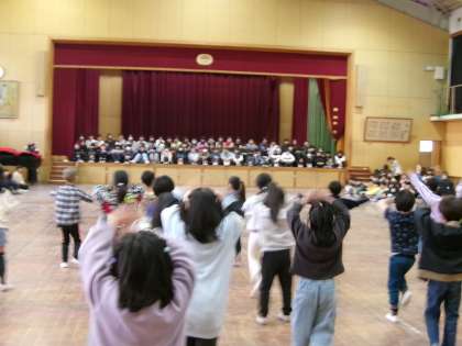 今日は6年生を送る会がありました。1年生は全校を代表して、プレゼントを渡した後、言葉とダンスで「ありがとう」を伝えました。