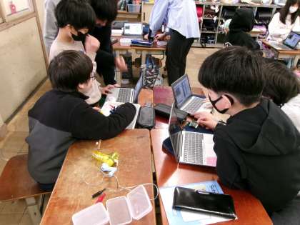 理科の学習で、マイクロビットを使ってプログラミングに挑戦していました。どのようなプログラムを作ればいいか、みんなで考えていました。