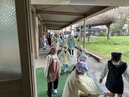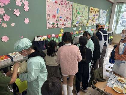 1年生の給食をお手伝いしに行きました。まさにスーパースターでした♪