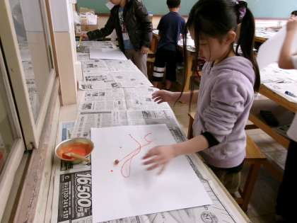 ビー玉を転がしたり、ストローでふいたりして、模様作りを楽しんでいました。