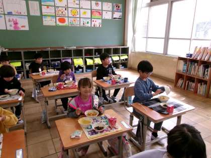 今日の給食はカレーライス。「おいしい!」「ちょっとからいけど、おいしい!!」と食べていました。