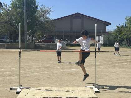 6年生の体育が始まりました。最初の単元は走り高跳び!助走や振上げ足に気を付けて跳んでいました。