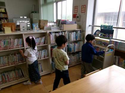 日野小学校の図書館で、はじめて本を借りました。おすすめの本を紹介している子もいました。
