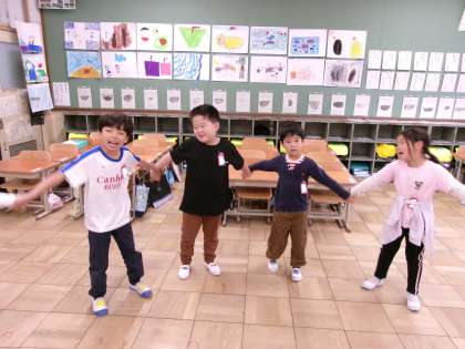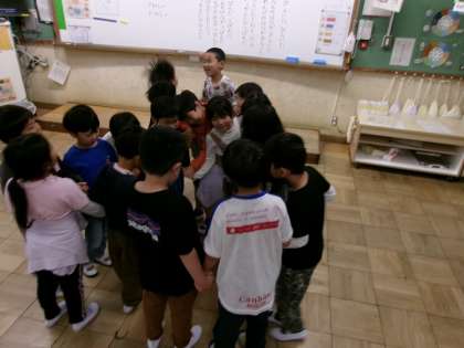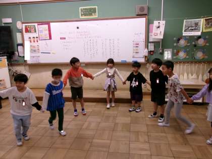 歌に合わせて、みんなで身体表現していました。みんなで手をつなぎ、「ひらいた」の歌詞で輪を大きくして、「しぼんだ」の歌詞で輪を小さくしていました。