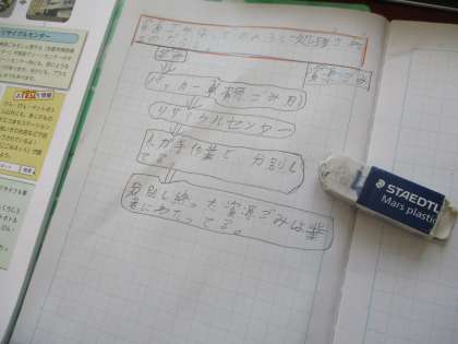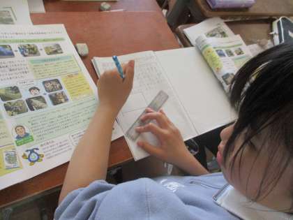 カンやビン,ペットボトルなどはどのように処理されるのだろう?教科書の資料から自分で調べてノートにまとめています。短い言葉で,矢印などを使って図式化すると,分かりやすくまとめられますね。