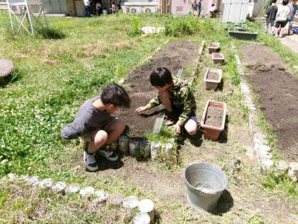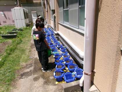 大豆などの種をまいて、水やりをしていました。理科の学習で観察していきます。
