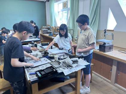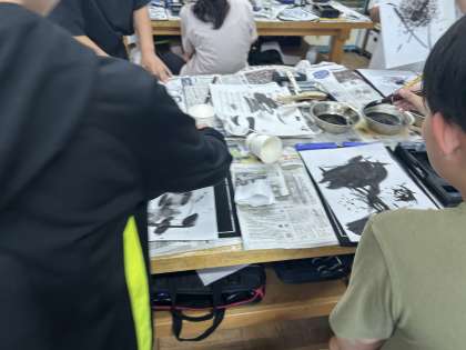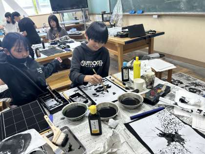 墨汁を使って絵を描きました。濃淡や線の大小,長い・短いなどを意識しながら描いていました。