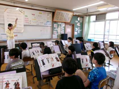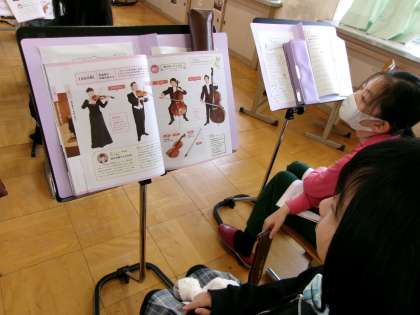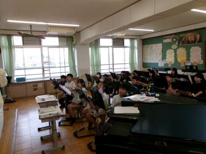 6年生が楽器について学習していました。背の高い校長先生と比べることで、大きさを実感していました。