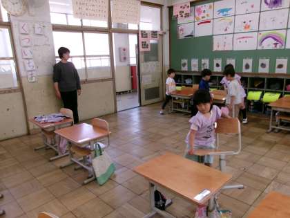 担任の先生といっしょに、そうじのしかたを確認していました。はりきって掃除していました。
