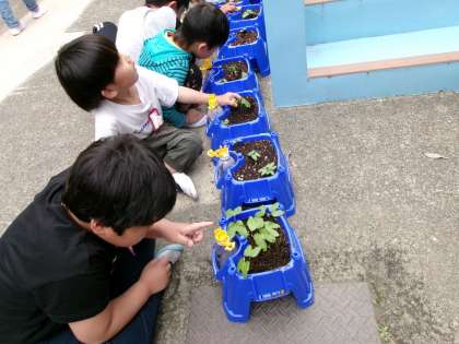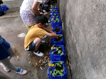 アサガオの芽が出てきたので、観察しました。指と比べて、どれくらいの大きさだったか話していました。