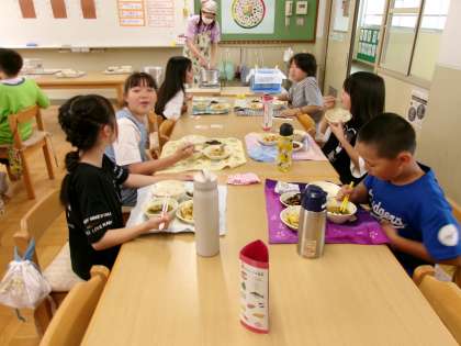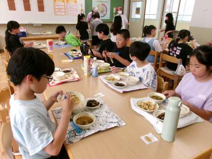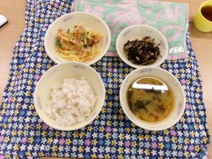 今日は和献立。新玉ねぎや新ジャガイモ、タケノコなど春の食材が多くてとてもおいしかったです。更に、ランチルームで食べることができて、よかったです。