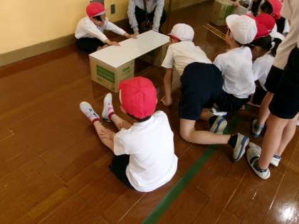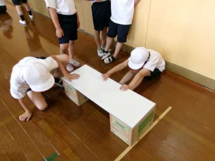 校務支援員さんに作っていただいた新しい器具を使って、長座体前屈に挑戦しました。