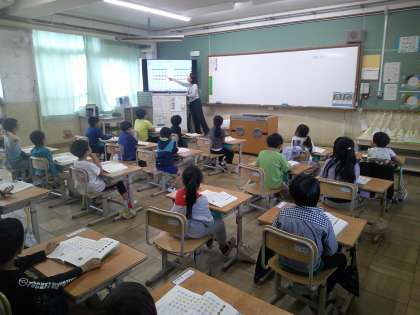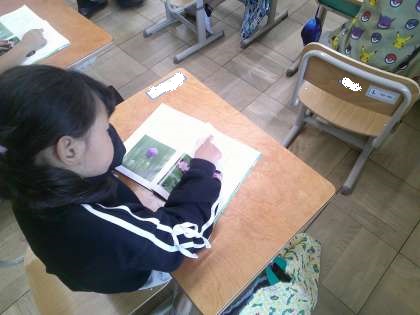 1組では、先生が本文を読んで、はさみ読みの練習をしていました。2組では、母音が同じ言葉を練習していました。