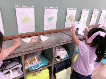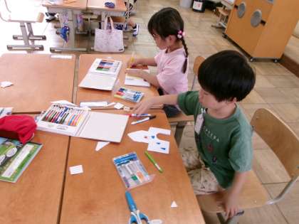 紙に絵を描いて、切って、折って、立てていました。小鳥や建物など、いい作品がいっぱいできていました。