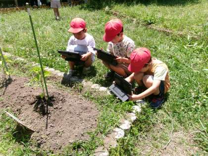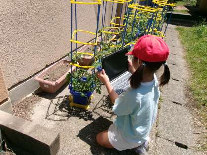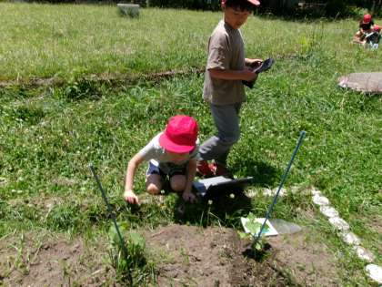 この前、植えていたピーマンやなす、きゅうり、とうもろこし、トマトなどを観察していました。タブレットをもって、観察する視点も確認して学習していました。