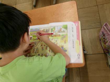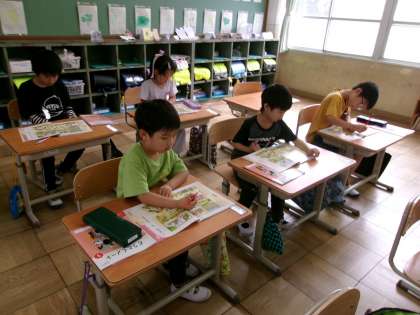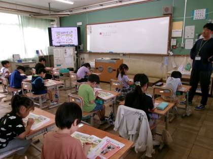 イラストを見ながら、道徳の学習をしていました。安全にかかわる善悪の判断について学習をしていました。