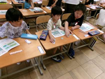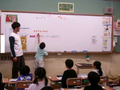 ブロック操作をして友だちと確認したり、ホワイトボードを使って全体に発表したりしながら、考えていました。