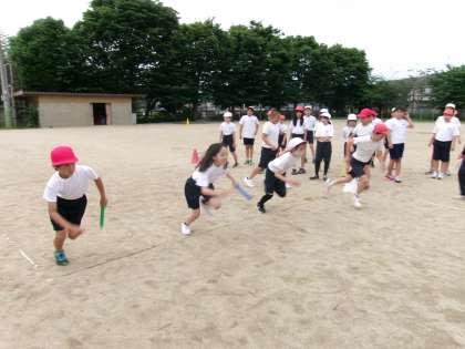 今日は、学年体育をしていました。クラス対抗ではなく、お互いのクラスのリレーのいいところを見つけていました。