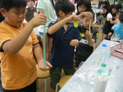 3つのスライムが作れると早速感触を楽しんでみました。昨年よりもうまくできたと満足顔で,伸ばしたり巻きつけたり,コップに三層に積み重ねてうっとり眺めたりしていました。
