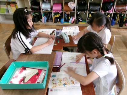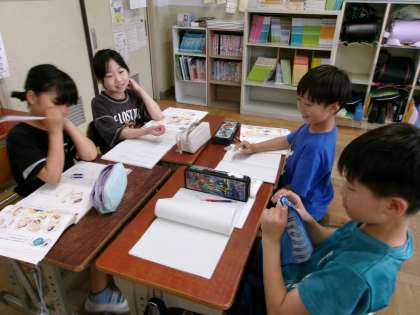 友だちと話し合うと、文章表現が豊かになります。いろいろアイデアをもらって、漢字を使って文を書いていました。