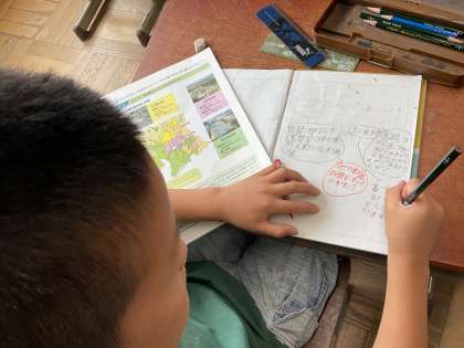 社会科では「くらしと水」の学習をしています。琵琶湖の水はどうやってきれいになるのかな?教科書をもとに調べています。書かれていることを見ながら「へええ,そうなんや。知らんかった!」とつぶやきも聞こえてきます。調べながら疑問や考えも浮かんでくるようです。それらもノートに書き込みなが調べることを楽しんでいます。